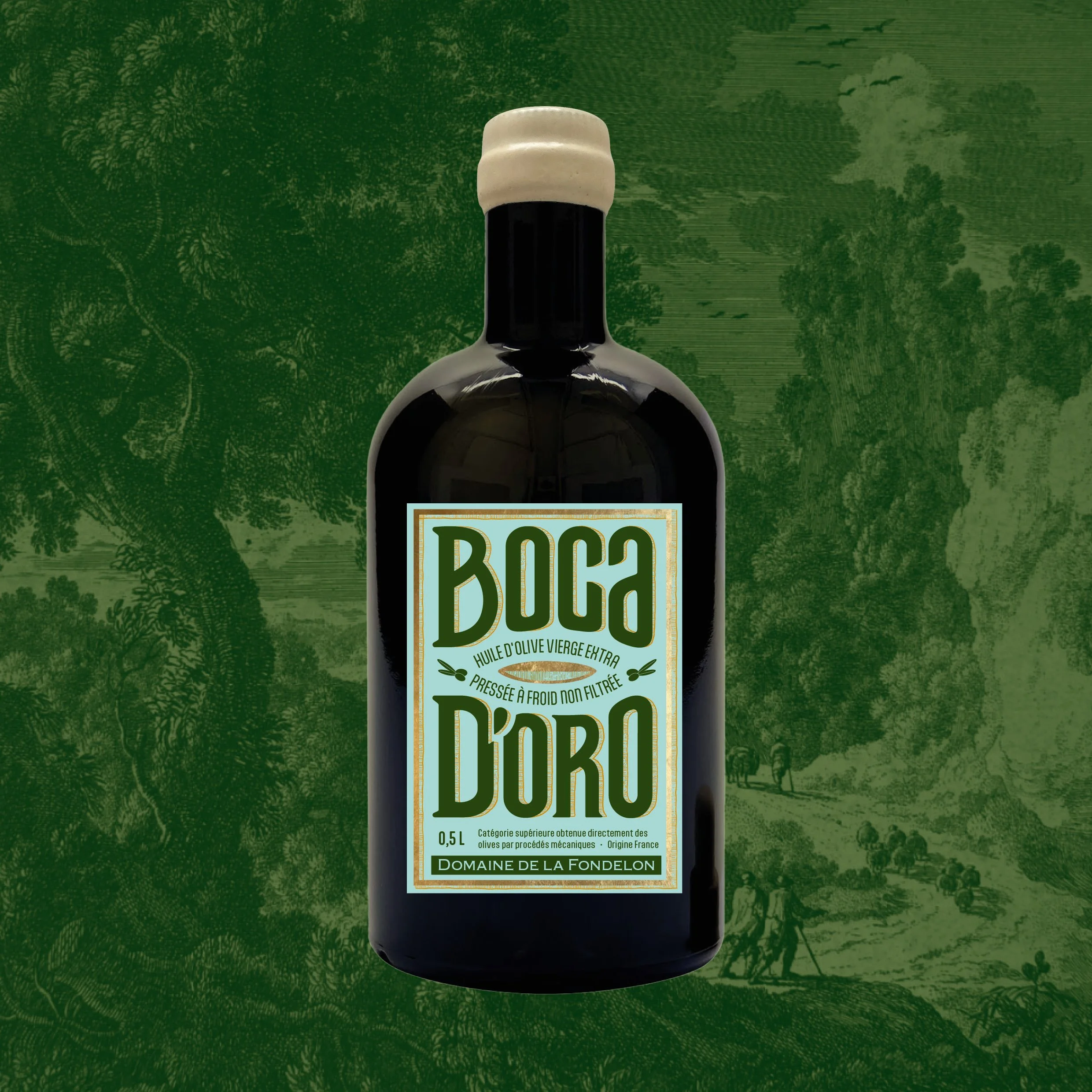 J’ai dessiné les lettres de Boca d’Oro (bouche d’or en vieil occitan) dans Procréate puis ai repris les parties vertes dans illustrator pour obtenir un tracé très précis et net, mais j’ai préservé l’aspect gravé irrégulier des ombrages dorés. La Fondelon c’est aussi du vin et des gites au coeur du domaine à découvrir sur leur site.