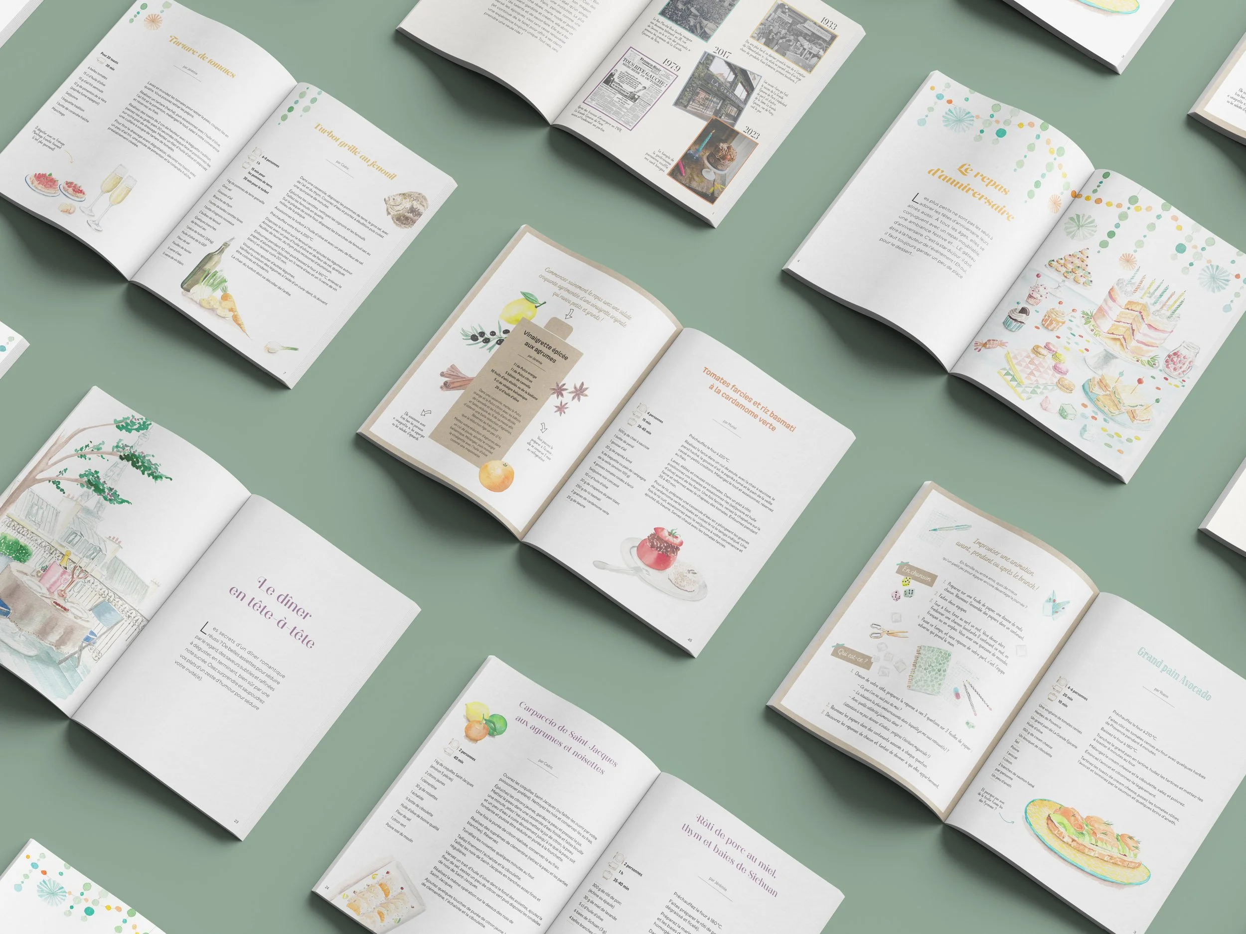 Un petit carnet A5 avec couverture façon kraft et couture Singer en fil noir, reprenant les codes visuels des totebags de la Grande épicerie. Le carnet se décompose en moments de vie avec une grande ouverture illustrée, sa typo propre, suivi de plusieurs doubles pages de recettes et idées. Les clientes souhaitaient expressément un carnet illustré et suivant l’ambiance du moodboard choisi (voir plus bas), l’agence Bergamote a confié la réalisation des illustrations à la talentueuse Caroline Massot. Fraicheur et douceur étaient bien au rendez-vous !