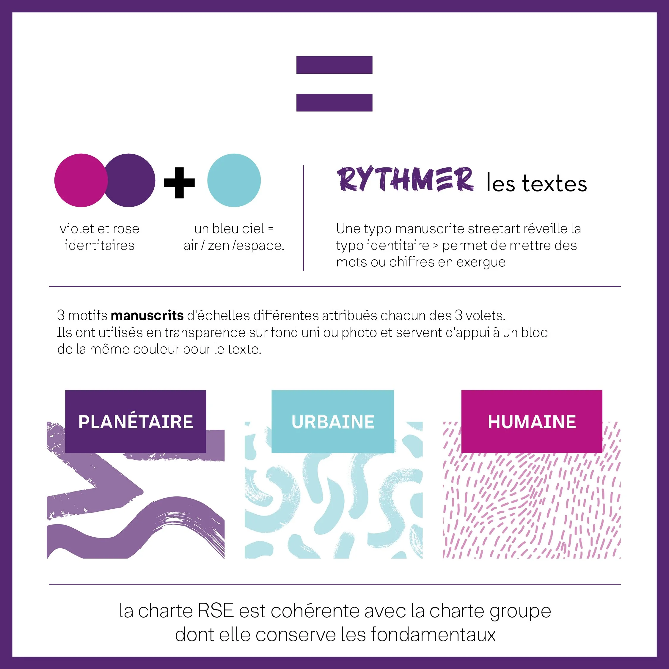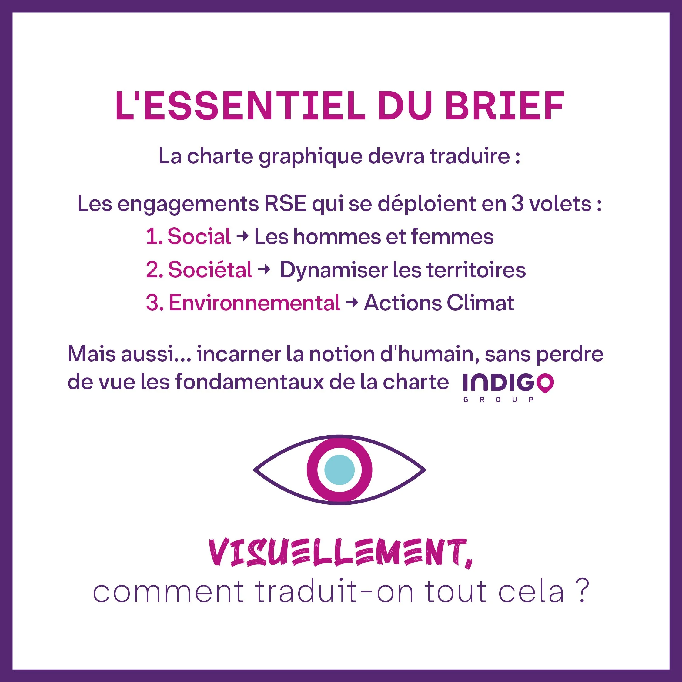 Généralement elle conserve les fondamentaux de la charte principale (couleur, typo) pour rester identifiée à la marque, mais on y ajoute des éléments forts qui rendent le sujet concerné repérable et unique. C'est la mission qu'Indigo Group a confiée à l'Agence Bergamote et pour laquelle j'ai été chargée de la direction artistique et du graphisme. La genèse de cette charte est résumée dans les slides ci-dessous. Elle a donné lieu à la création de divers gabarits comme des post linkedin, et plus largement à un document définissant les guidelines. Nous l'avons aussi mise en pratique dans la brochure de 32 pages présentant les engagements RSE de Indigo Group.