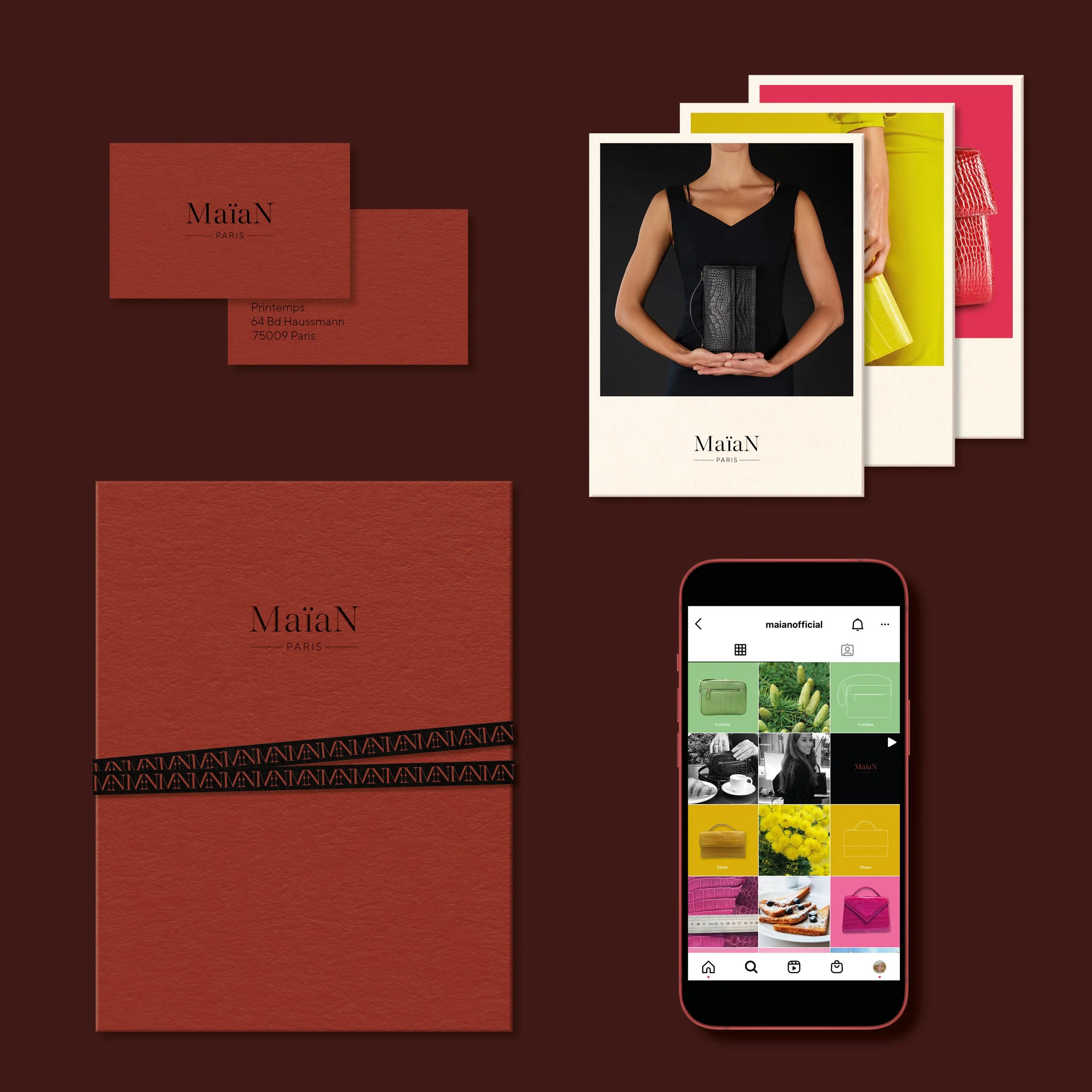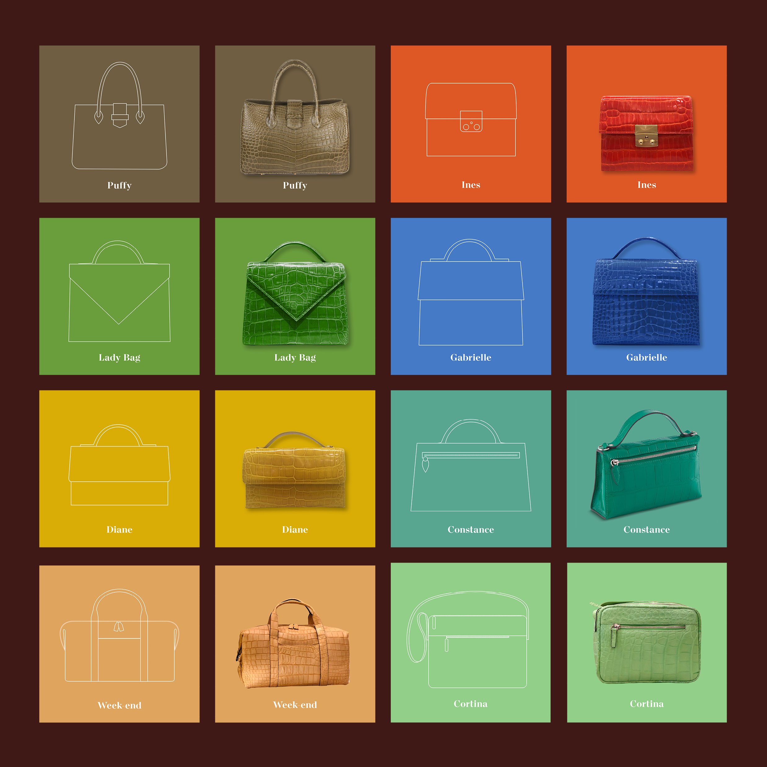 J’ai dessiné au trait, sous illustrator, tous les sacs de la collection MaïaN. Le parti pris graphique et photographique est le ton sur ton qui permet de mettre en valeur mais tout en sobriété, la large gamme de couleur des sacs.